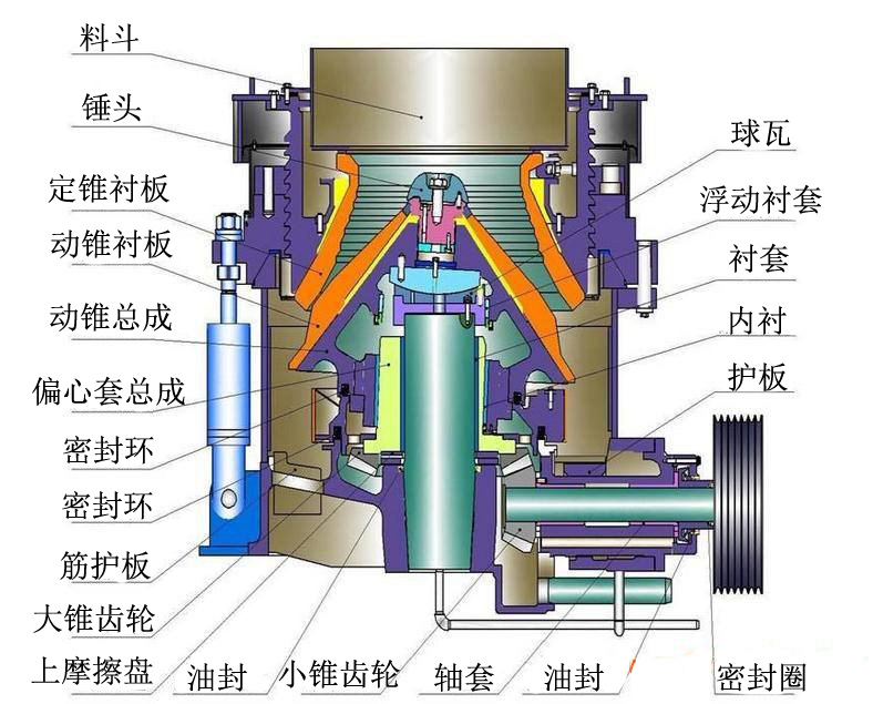 工作原理:電機(jī)通過傳動(dòng)裝置帶動(dòng)偏心套旋轉(zhuǎn),動(dòng)錐在偏心套的迫動(dòng)下做旋轉(zhuǎn)擺動(dòng),動(dòng)錐靠近靜錐的區(qū)段形成破碎腔,物料受到動(dòng)錐和靜錐的多次擠壓而破碎,動(dòng)錐離開該區(qū)段時(shí),該處已破碎至合格粒度的物料在重力作用下下落,從錐底排出。