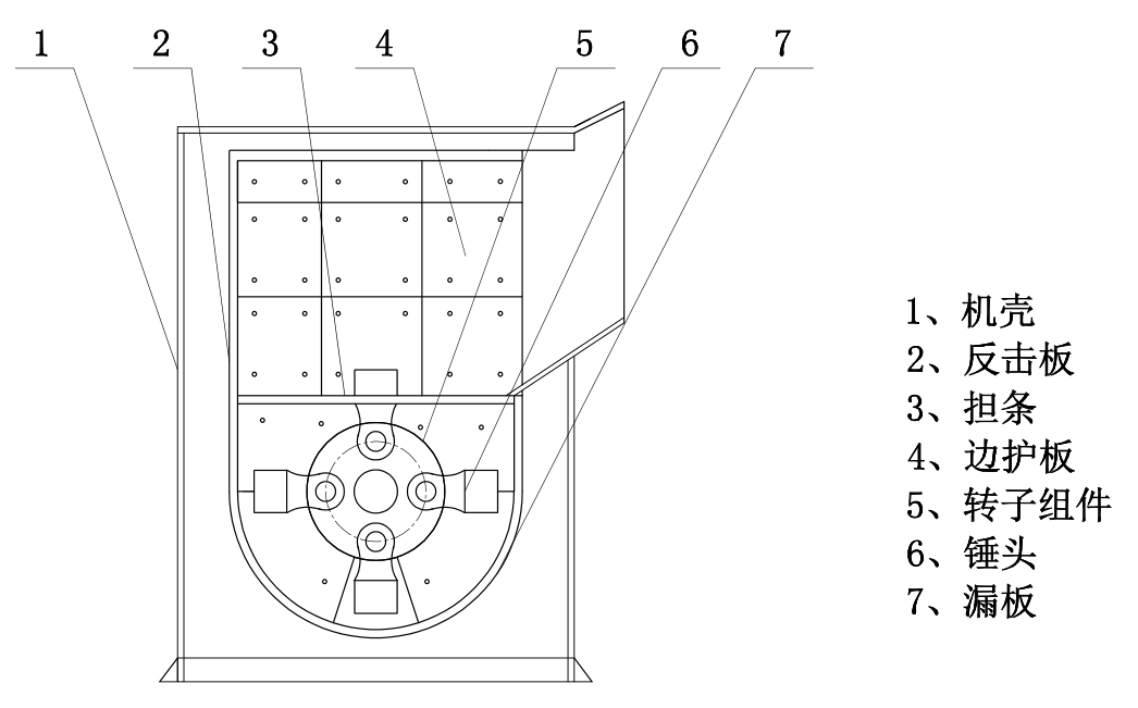 工作原理:電機(jī)經(jīng)皮帶輪傳動(dòng)帶動(dòng)轉(zhuǎn)子旋轉(zhuǎn),使裝在轉(zhuǎn)子盤上的錘頭做高速圓周運(yùn)動(dòng),當(dāng)物料進(jìn)入破碎腔后,大塊物料堆放在機(jī)內(nèi)中部的擔(dān)條上,被高速旋轉(zhuǎn)的錘頭擊碎,粒度不合格的大物料和新物料被打向反擊板和漏板進(jìn)行再次破碎直至合格,合格的物料經(jīng)漏板排出。
