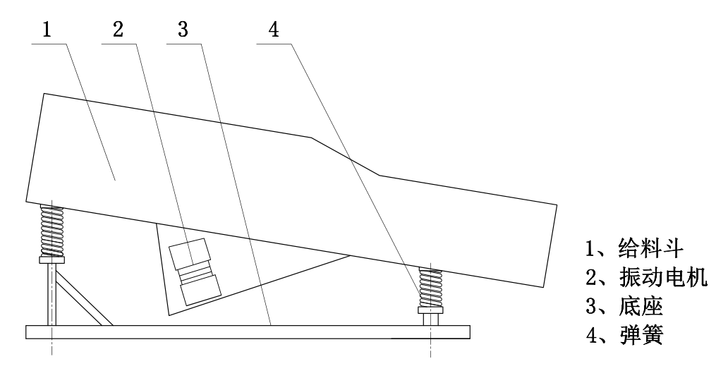 工作原理:采用兩臺(tái)振動(dòng)電機(jī)直接驅(qū)動(dòng),通過(guò)彈簧力的作用將電機(jī)的自身振動(dòng)轉(zhuǎn)變?yōu)榻o料斗的全幅振動(dòng),從而達(dá)到給料的目的。